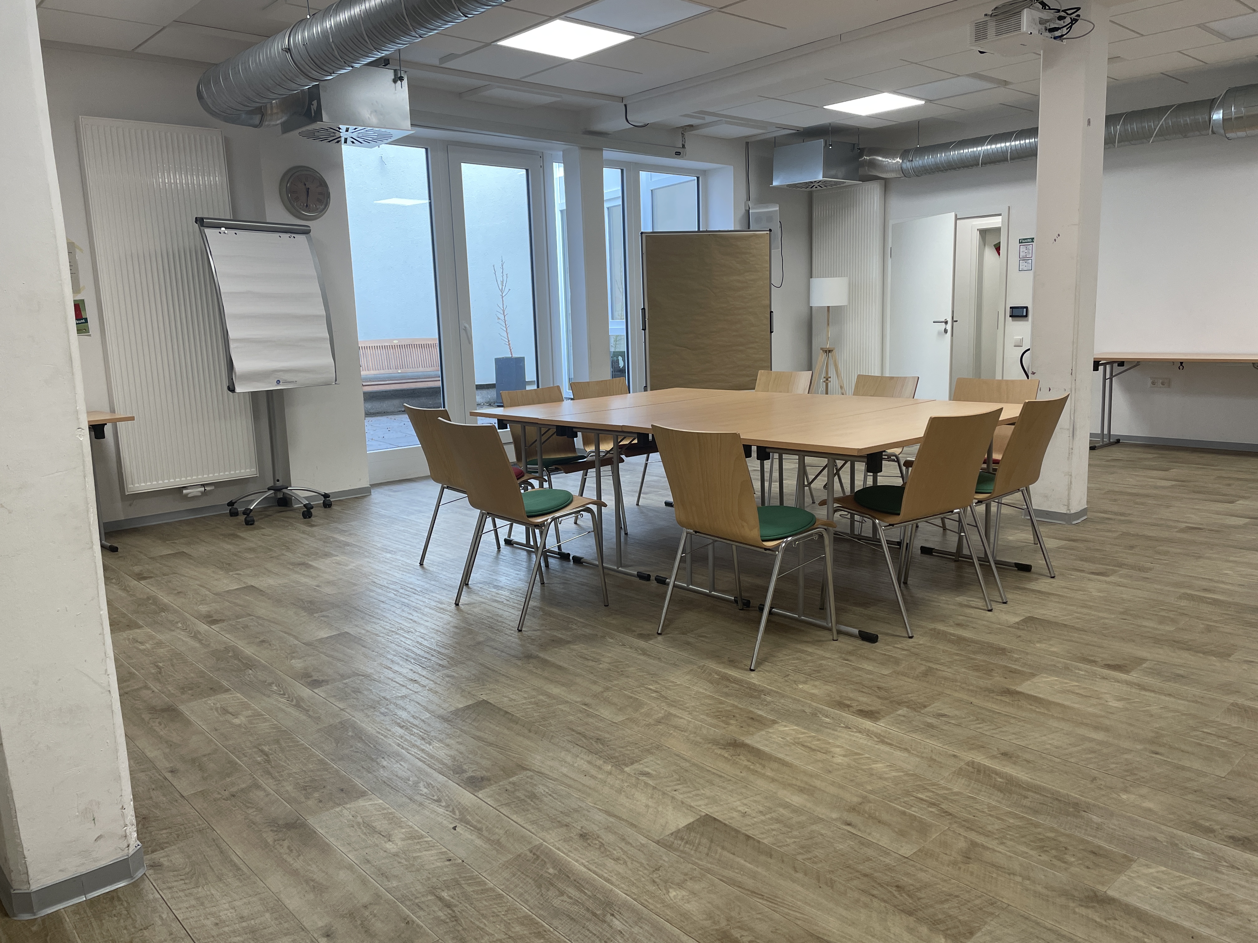 Neben den Büros gibt es zwei Seminarräume, welche für Veranstaltungen jeglicher Art genutzt und gebucht werden können. Der große Raum bietet Platz für ca. 30 (max. 40) Personen und der kleine Raum Platz für ca. 15 (max. 20) Personen. In der Pauschale enthalten sind Beamer, Leinwand, W-Lan, Moderationskoffer, Pinnwand und Flipchart. Außerdem können Getränke auf Wunsch gestellt werden und die Küche gegen einen Aufpreis genutzt werden. Für Bilder, bitte nach unten scrollen.